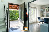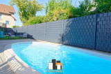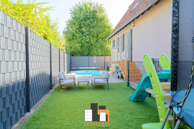 Jardin: terrasse plein sud en sortie de salon et accès espace de jeux par la cuisine (trampoline etc) et piscine chauffée par PAC