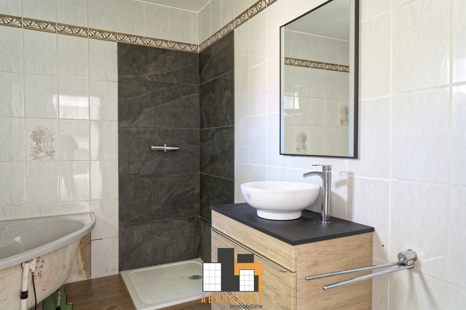 RDC: grande pièce cuisine semi-équipée, 1 chambre ou salon, 1 salle de bains (douche paroi en cours d'installation et baignoire tablier en cours d'installation)