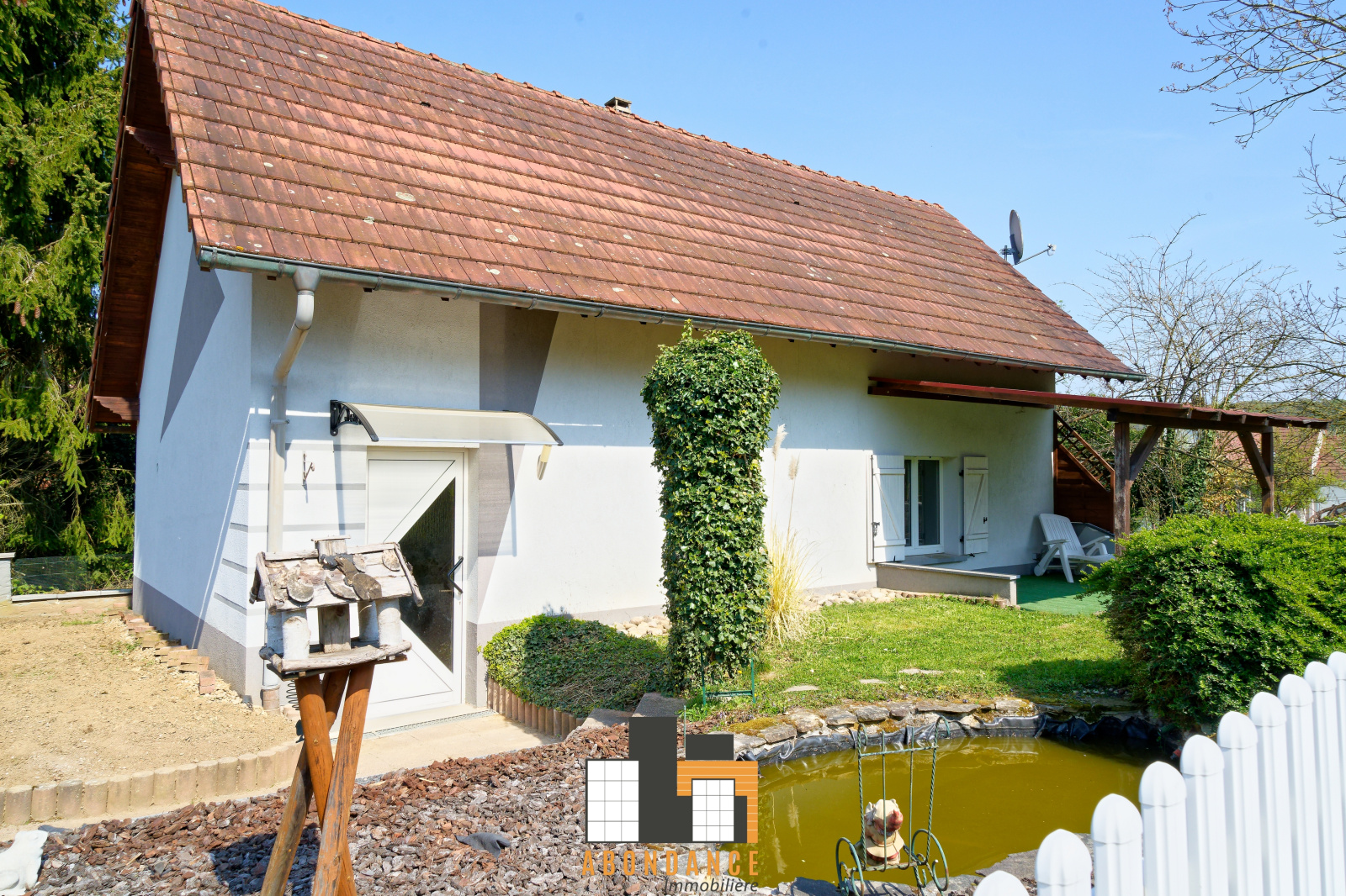 Terrain: 2.39a au calme orienté SUD/OUEST avec terrasse et bassin à poissons.