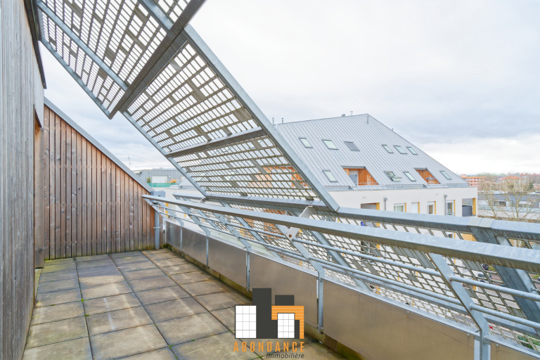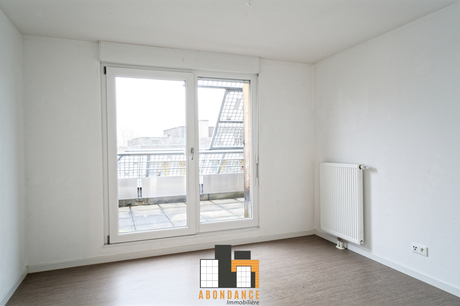 Strasbourg quartier Montagne Verte immeuble de 2016 en seconde ligne, située au 5ème et dernier étage avec ascenseur F2 de 35.31m2 + terrasse de 13.59m2 plein ouest.