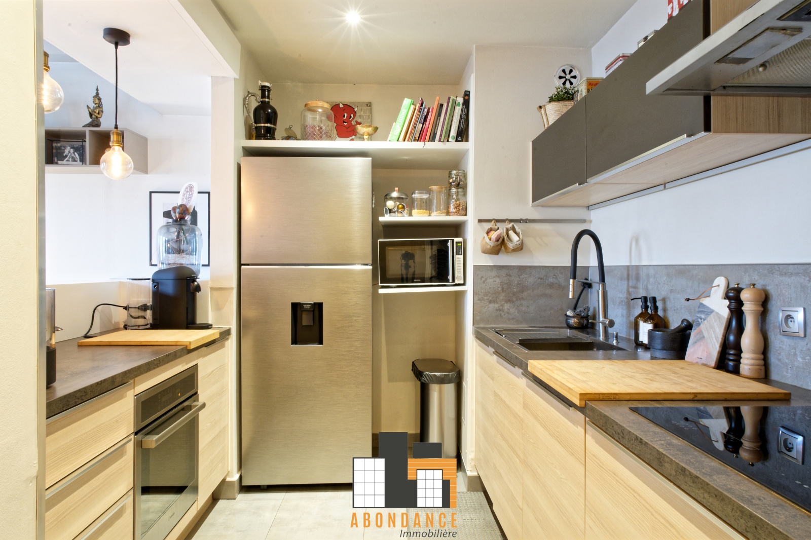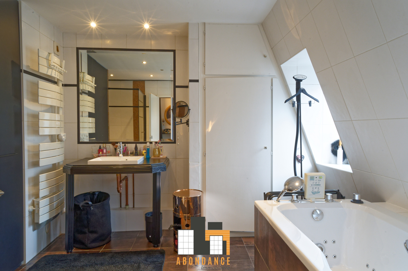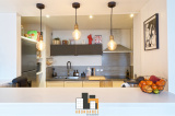 Premier niveau: un grand salon séjour de 39.33m2 plein ouest, cuisine ouverte équipée. 1 débarras, 1 wc séparé, 1 grande salle de bains (baignoire balnéo, douche à l'italienne, armoire buanderie).