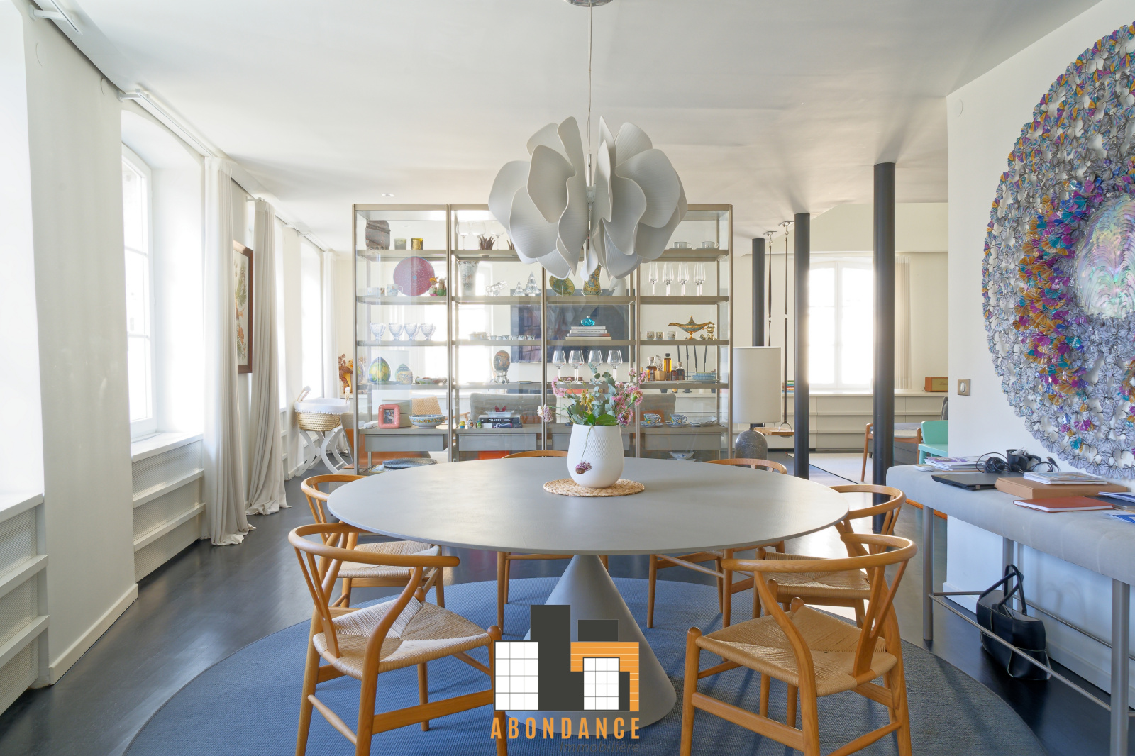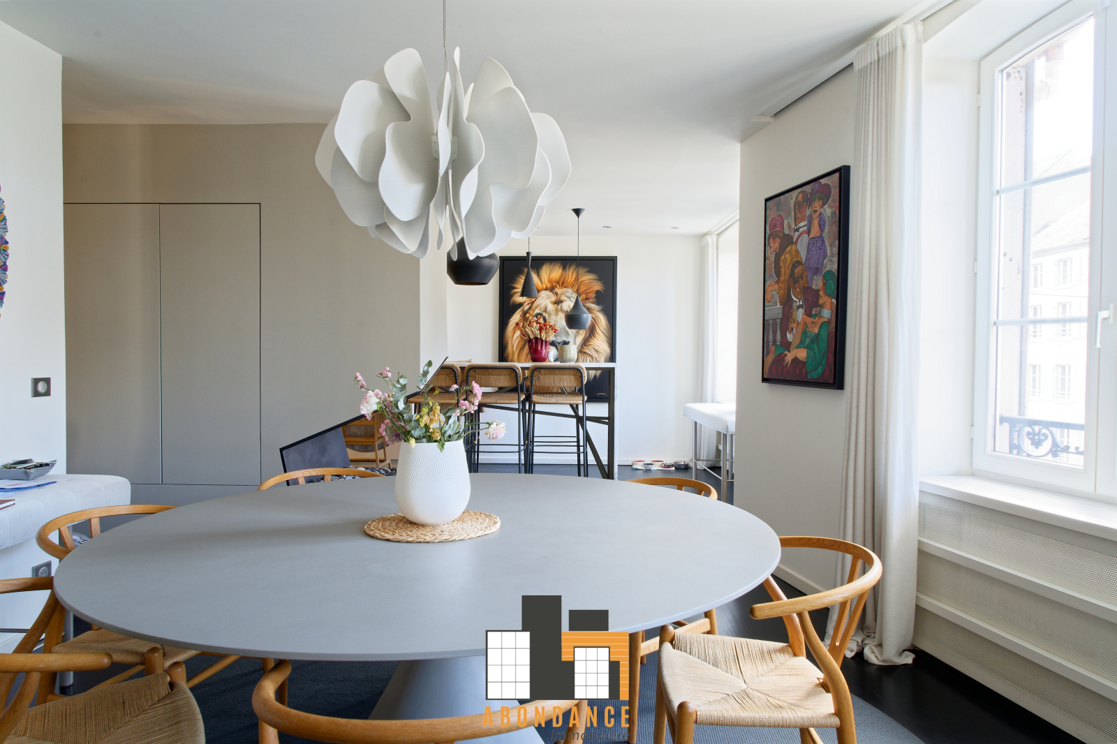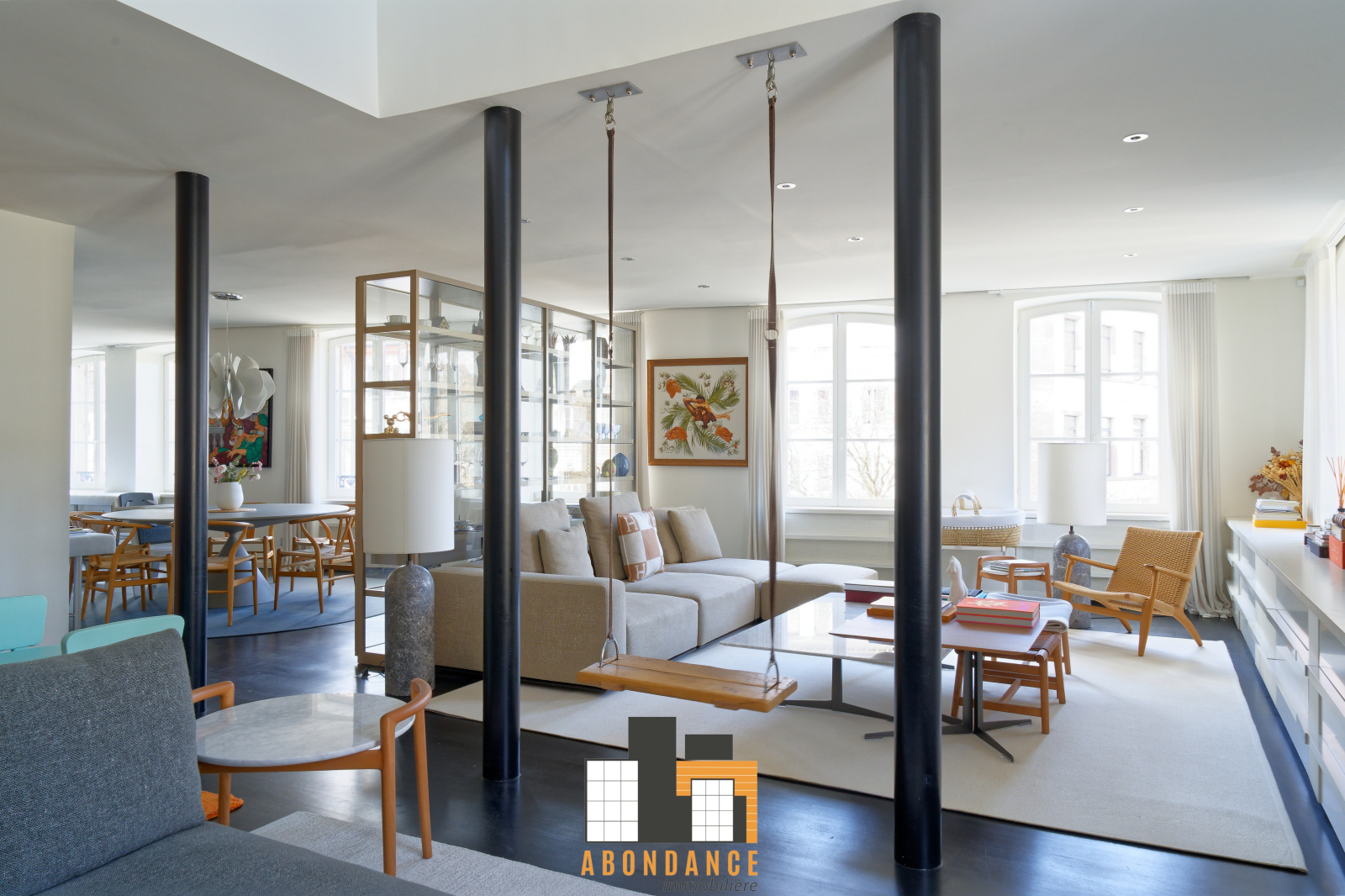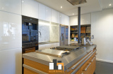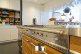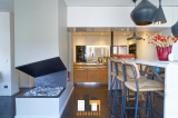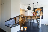Premier niveau: Salon séjour de 82m2 avec parquet + cuisine haut de gamme avec piano de cuisson de 13m2