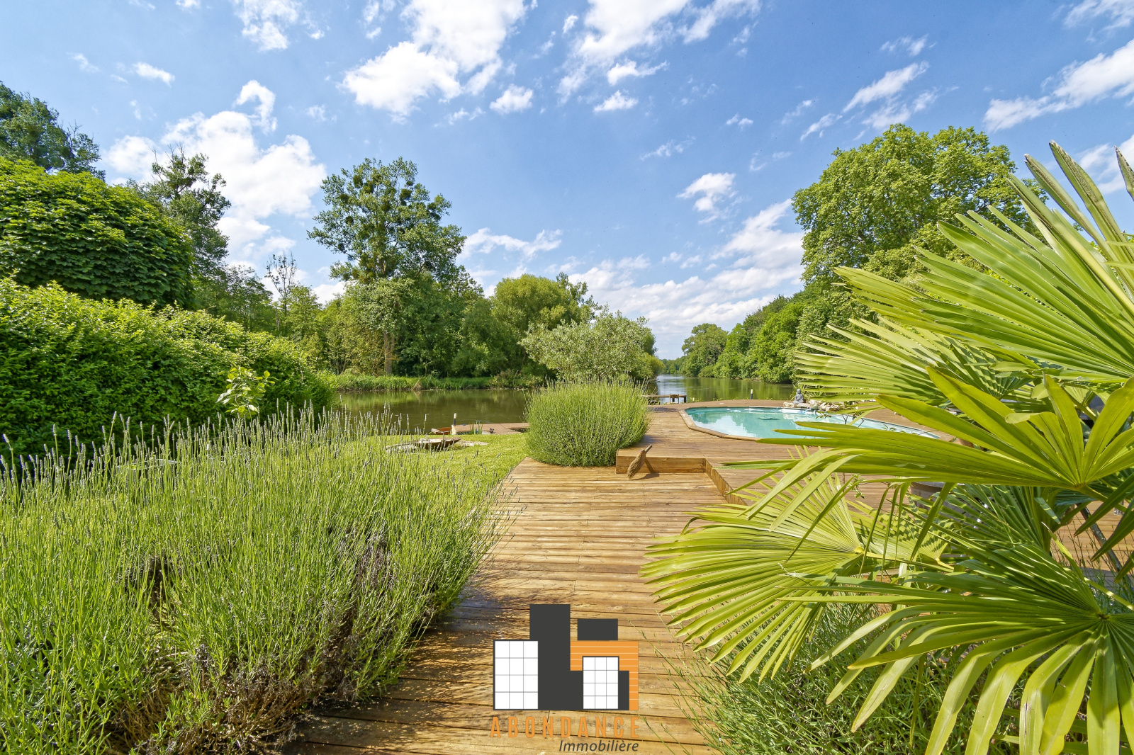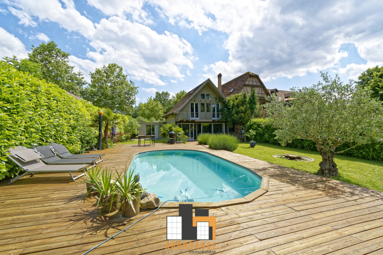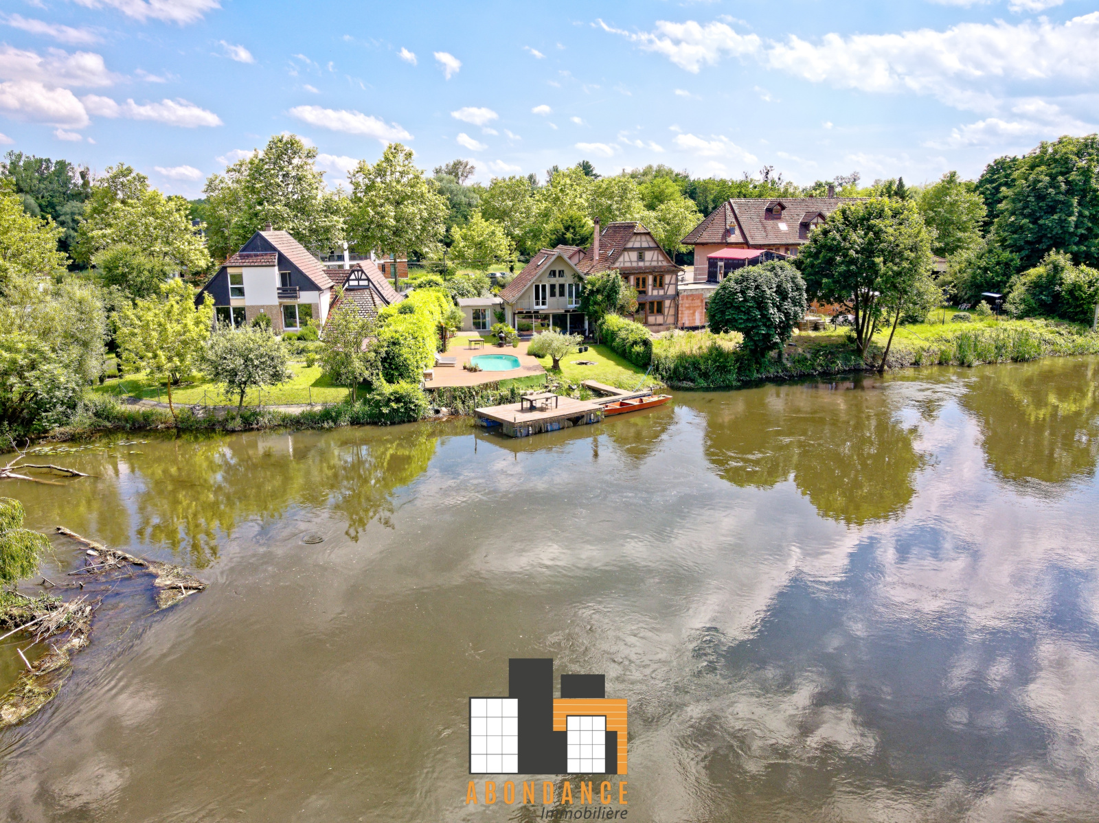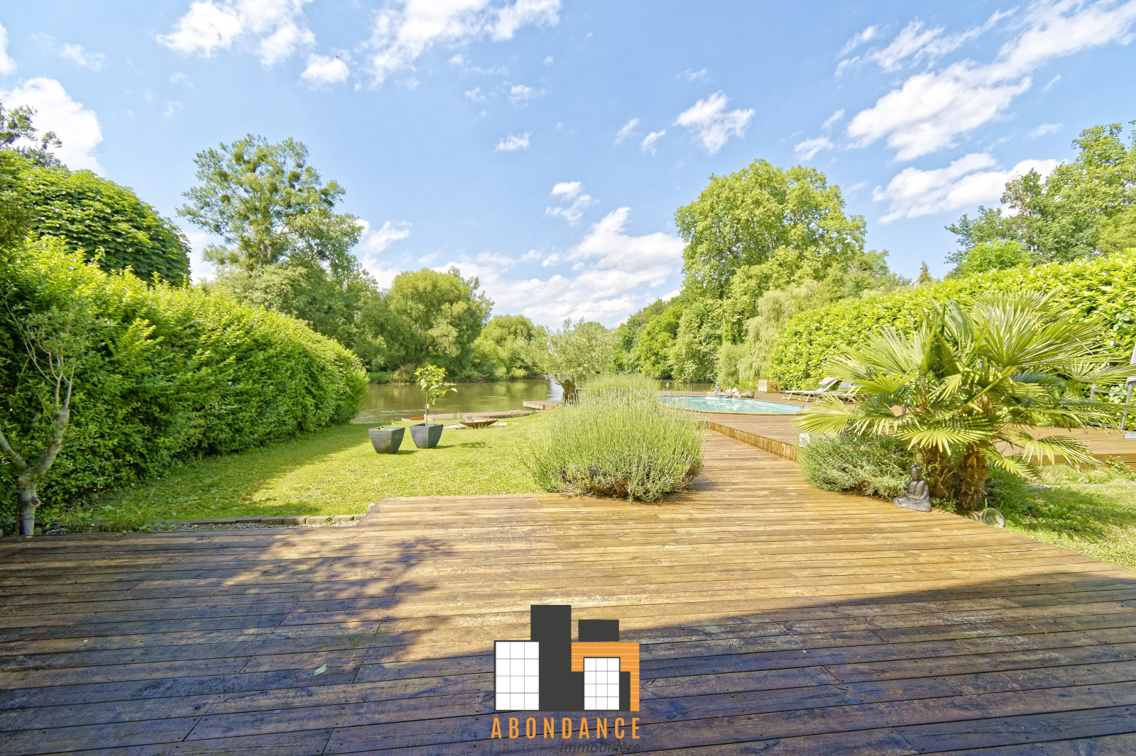Strasbourg Robertsau havre de paix au caractère singulier avec vue exceptionnelle sur l'Ill. Surface au sol de 144m2 pour 100.75m2 habitable sur terrain privatif de 3.45a + environ 2.5a en jouissance avec piscine chauffée et ponton flottant pouvant accueillir un bateau amarré