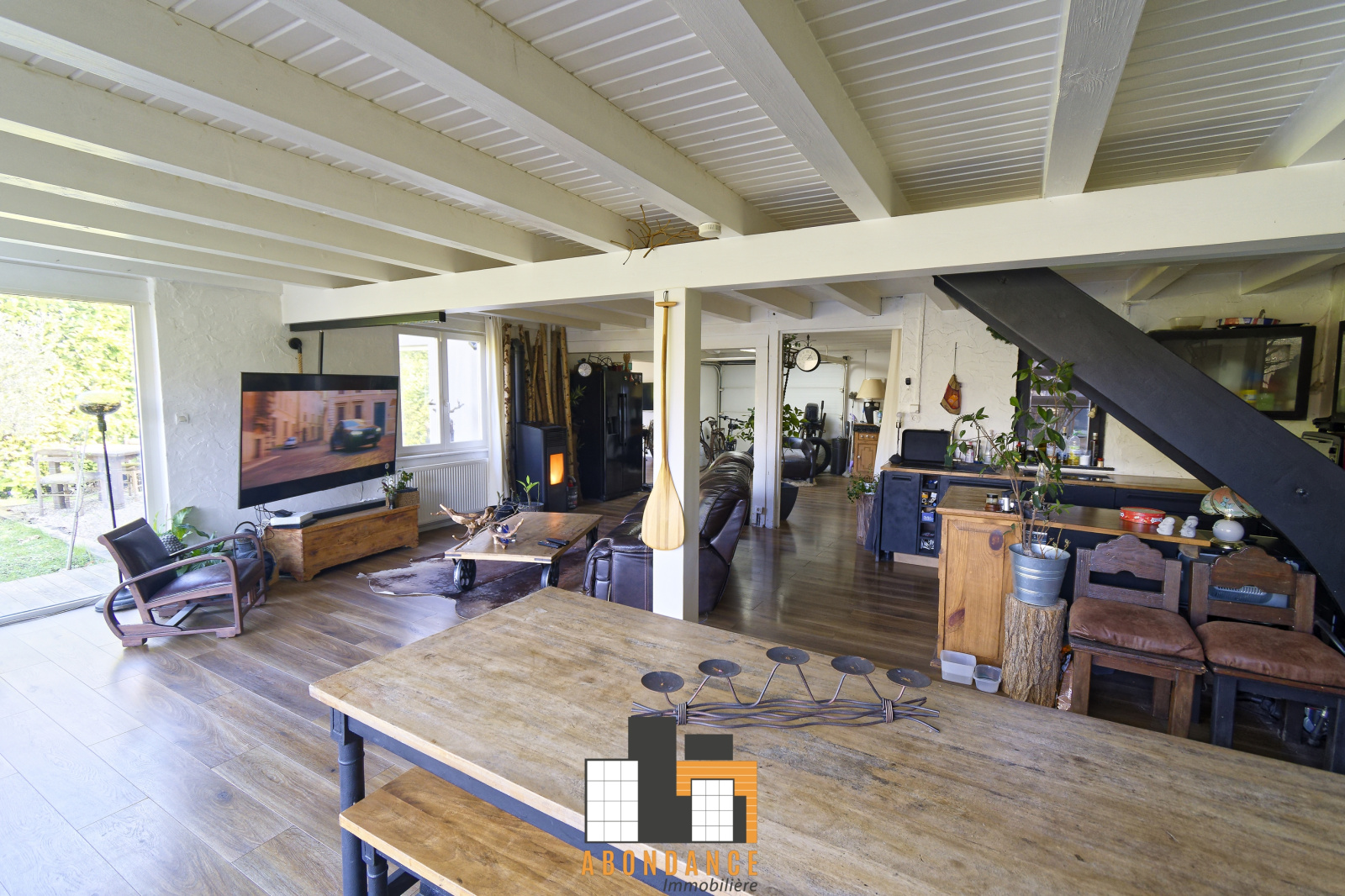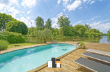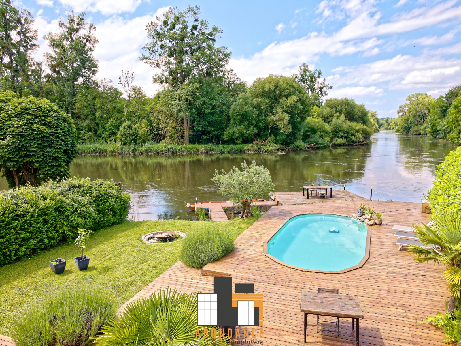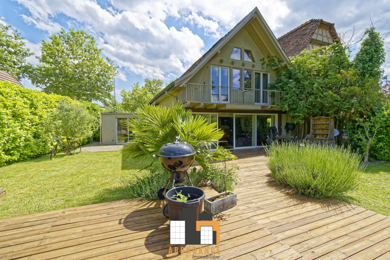 Strasbourg Robertsau havre de paix au caractère singulier avec vue exceptionnelle sur l'Ill. Surface au sol de 144m2 pour 100.75m2 habitable sur terrain privatif de 3.45a + environ 2.5a en jouissance avec piscine chauffée et ponton flottant pouvant accueillir un bateau amarré