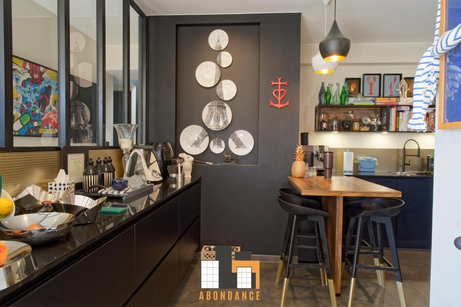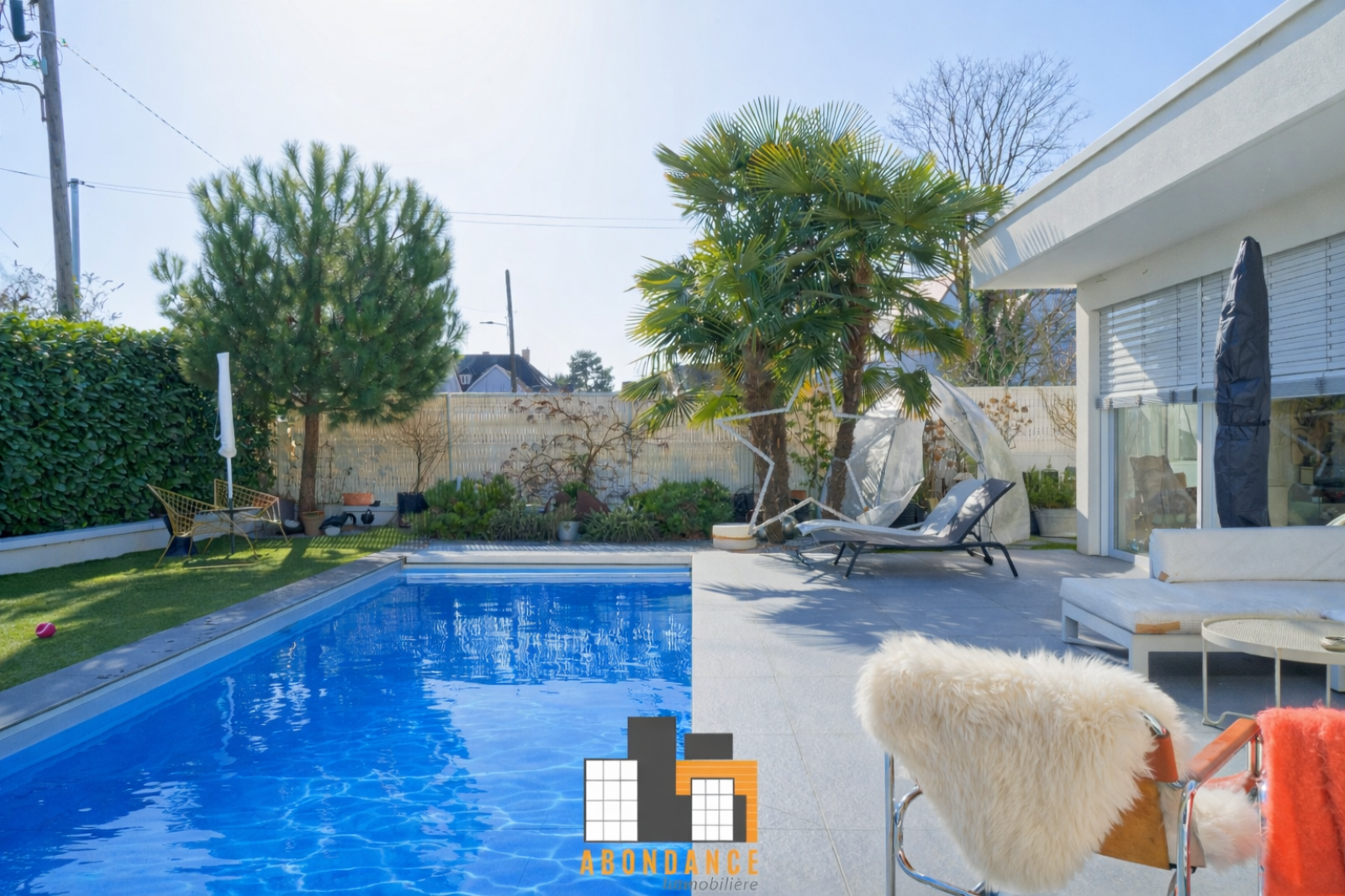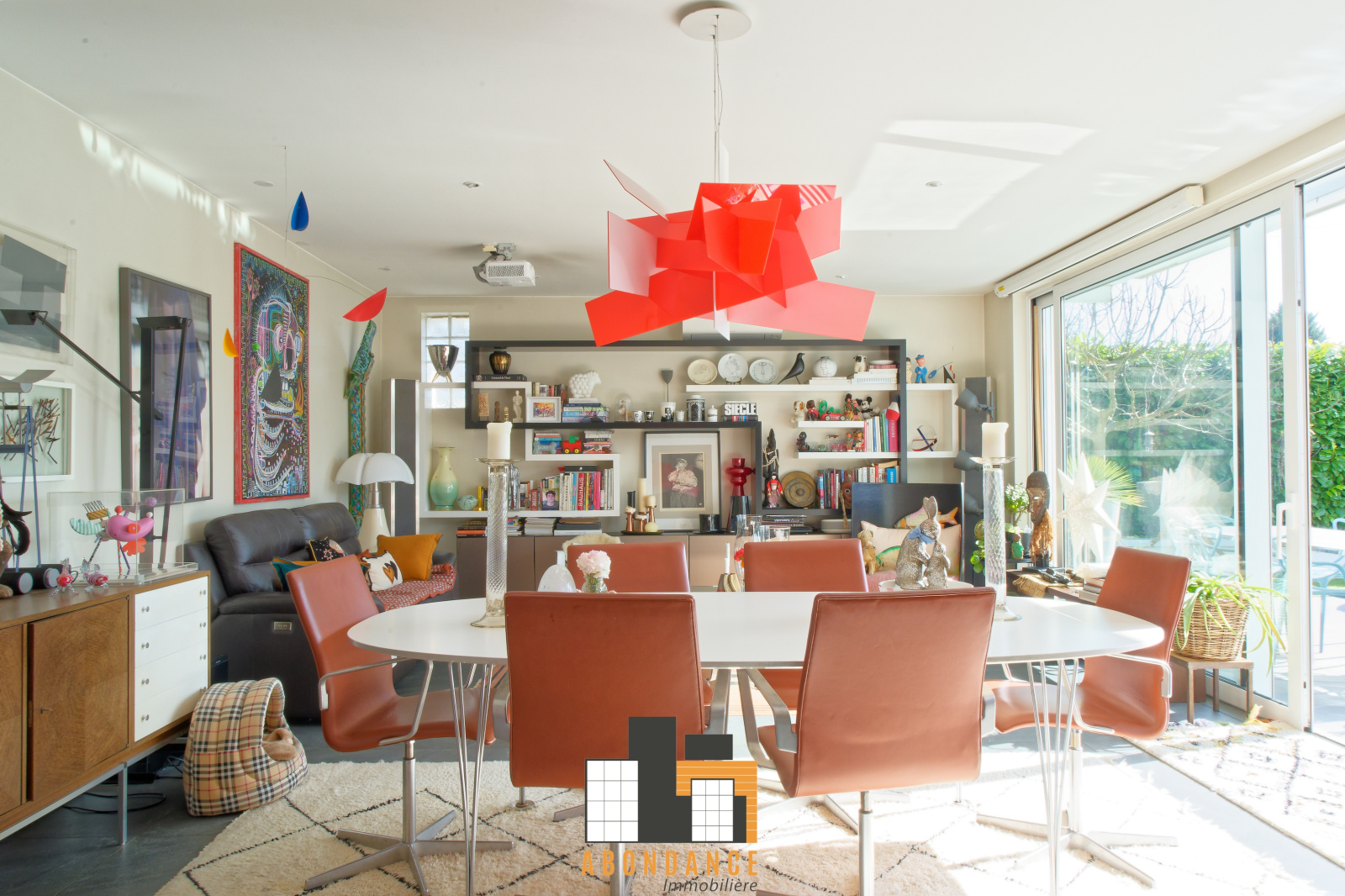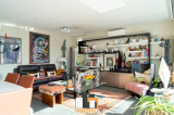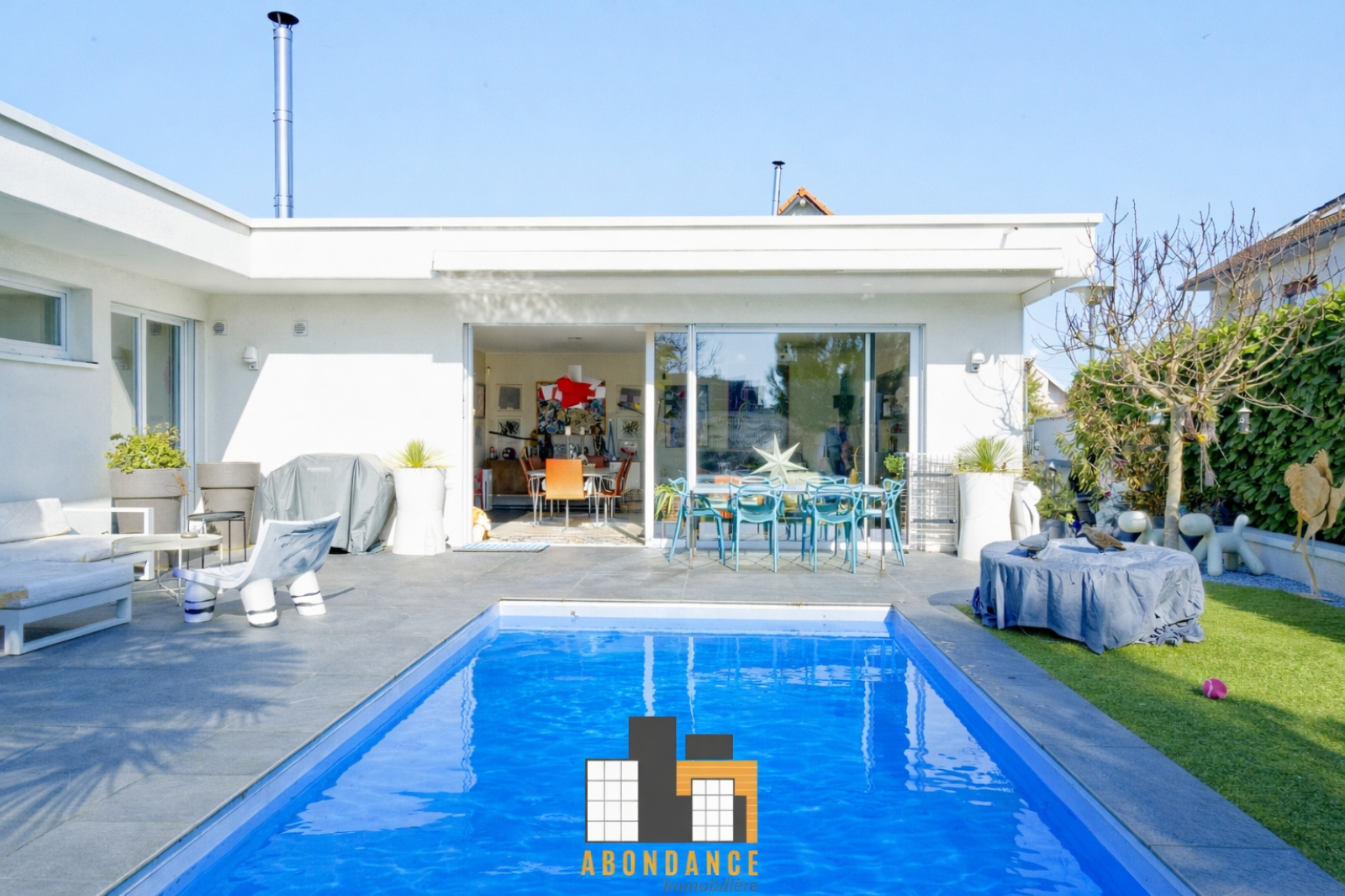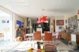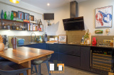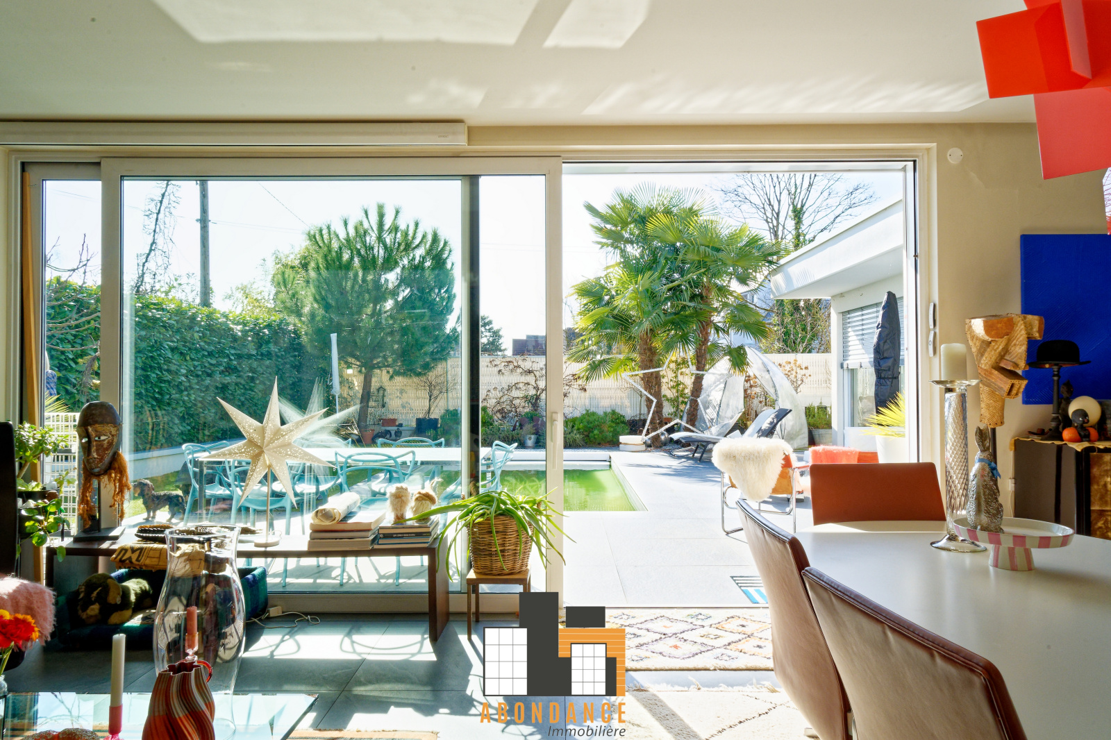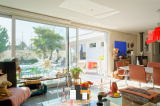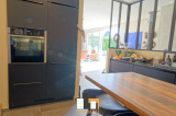 salon séjour de 42m2 avec poêle à bois donnant sur 1 baie vitrée coulissante accès terrasse piscine et espace vert. Cuisine équipée moderne avec verrière type loft US. + 1wc invités